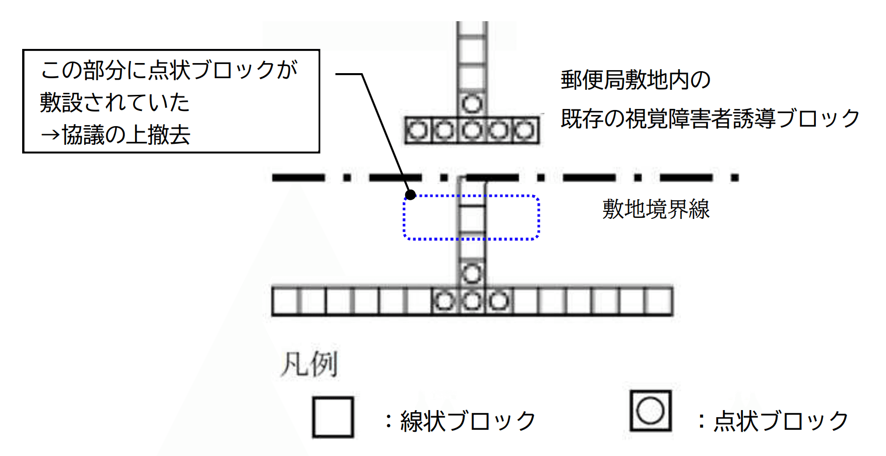 江東区においては、2005(平成 17)年度より交通バリアフリー法に基づく基本構想の策定に着手し、2006(平成 18)年度には基本構想に基づく特定事業計画の検討を進めた。 基本構想において特定経路として設定されていた永代通りについては、特定経路の整備方針として、視覚障害者誘導用ブロックを連続的に敷設した連続誘導を行うこととされていた。 東陽町駅改良工事に伴う道路復旧工事中という機会を捉え、視覚障害者等を含めた現地点検等のワークショップを開催し、放置自転車等の障害物を避けた最も歩きやすい連続敷設の位置(歩道中央ではなく建物側から 1.5m 離れた位置とした)、交差点部分の敷設方法、バス停、駅出入口、建物への連続的な案内方法等を検討し、ワークショップの成果として連続敷設の案を作成して、工事へと反映させた。 駅周辺では、駅出入口、バス停、タクシー乗降場等、様々な場所への誘導をしなくてはならず、交差点も多いことから視覚障害者誘導用ブロックの敷設は複雑になりやすい。そのなかで施設内に音声誘導システムが設置されていた郵便局には、連続誘導をすべきと整理された。 敷設途中に現場確認を行ったところ、郵便局との敷地境界に歩道側での警告ブロック(点状ブロック)が敷設され、警告ブロックが二重敷設となっており、協議の上、その警告ブロックは撤去することとした。(図参照) 建築敷地と歩道とのどちらに先に視覚障害者誘導用ブロックが敷設されているかは、その現場の状況によるが、関係者間の連携によって、安全を確保した効率的でわかりやすい敷設が求められる。