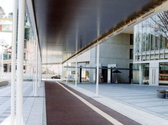 敷地内の通路の上屋、視覚障害者誘導用ブロックの連続敷設(床仕上げの材料の変化と明度差に配慮した通路により、わかりやすいデザインとしている。)