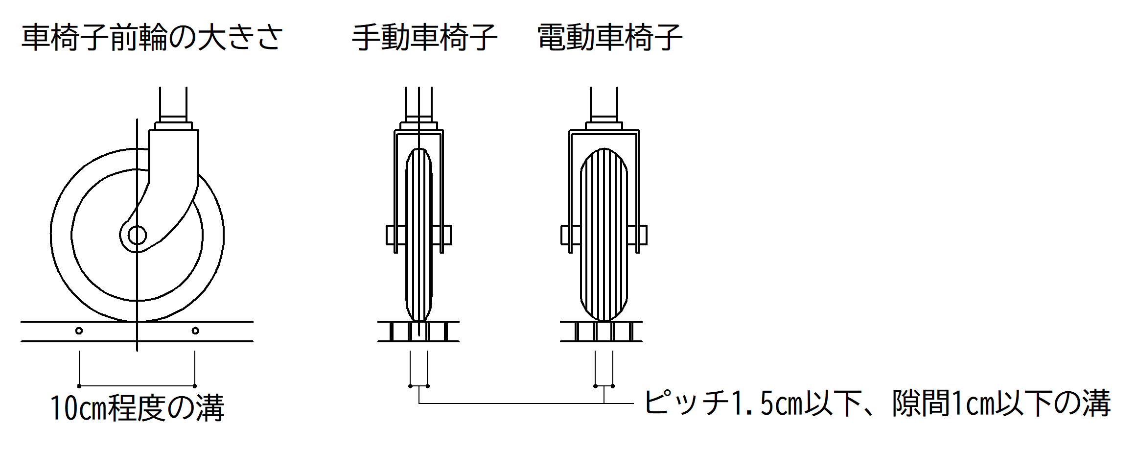主要な経路上にある排水溝等の蓋のスリット等は、杖先や車椅子のキャスター等が落ち込まないよう目が細かい構造(ピッチ:1.5cm 下、隙間:1cm 以下)とし、濡れても滑りにくい仕上げとする。
