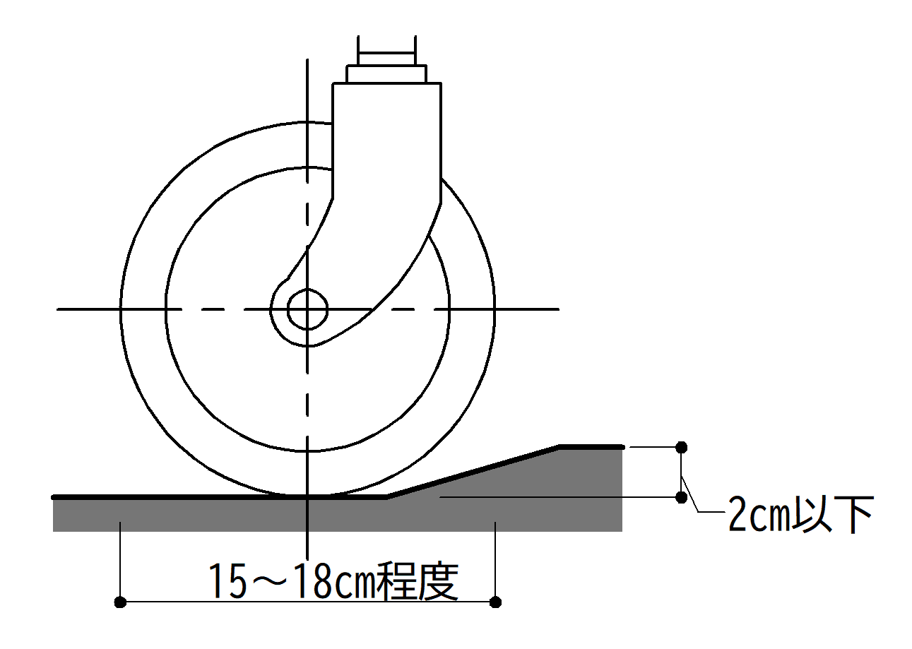 杖等による危険の認知、車椅子のキャスター等の脱輪防止等のため、側壁がない傾斜路側端には、5㎝ 以上の立ち上がりを設けることが望ましい。