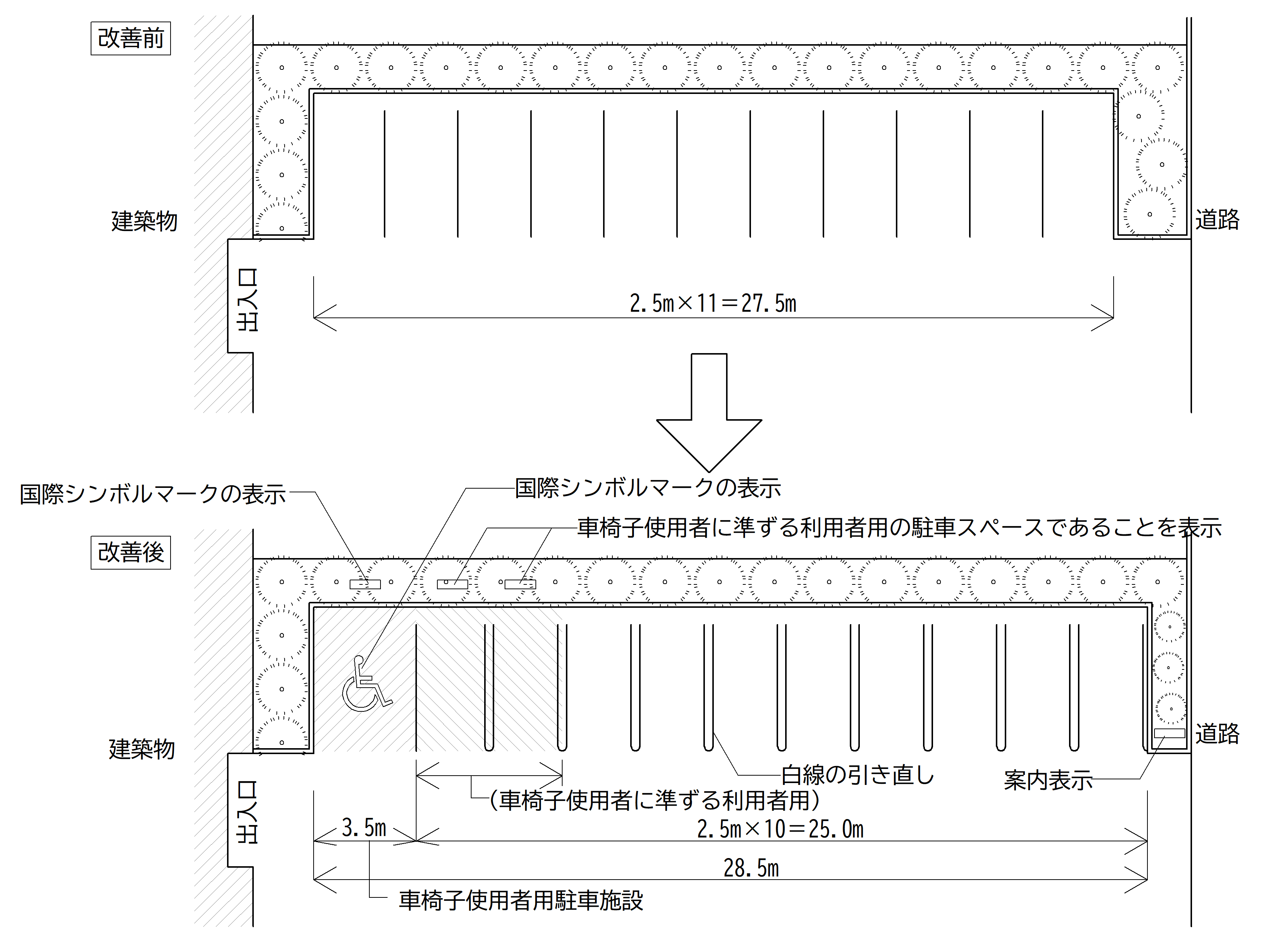 | 1 | 既存駐車場内において、一部のエリアで車高が確保できる場合には、車椅子使用者用駐車施設を設け、当該エリアの車高制限や誘導案内表示を行う。 |